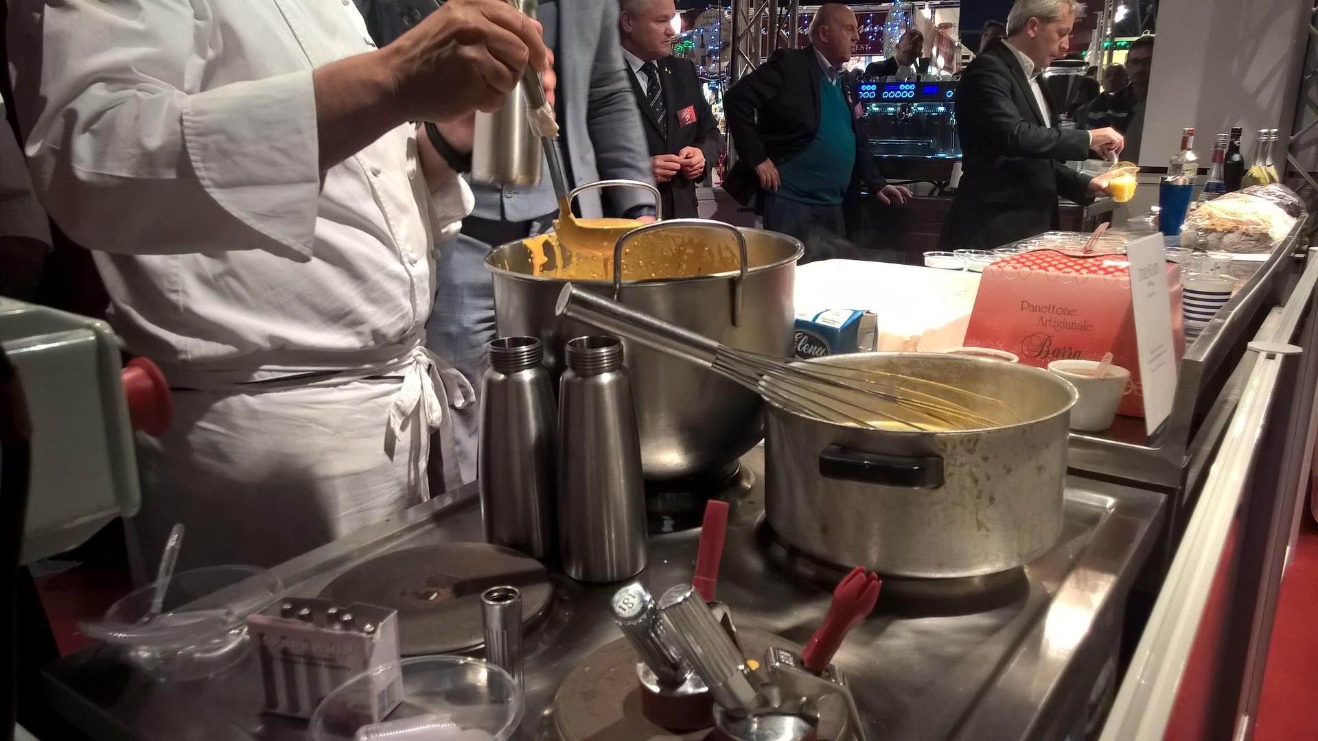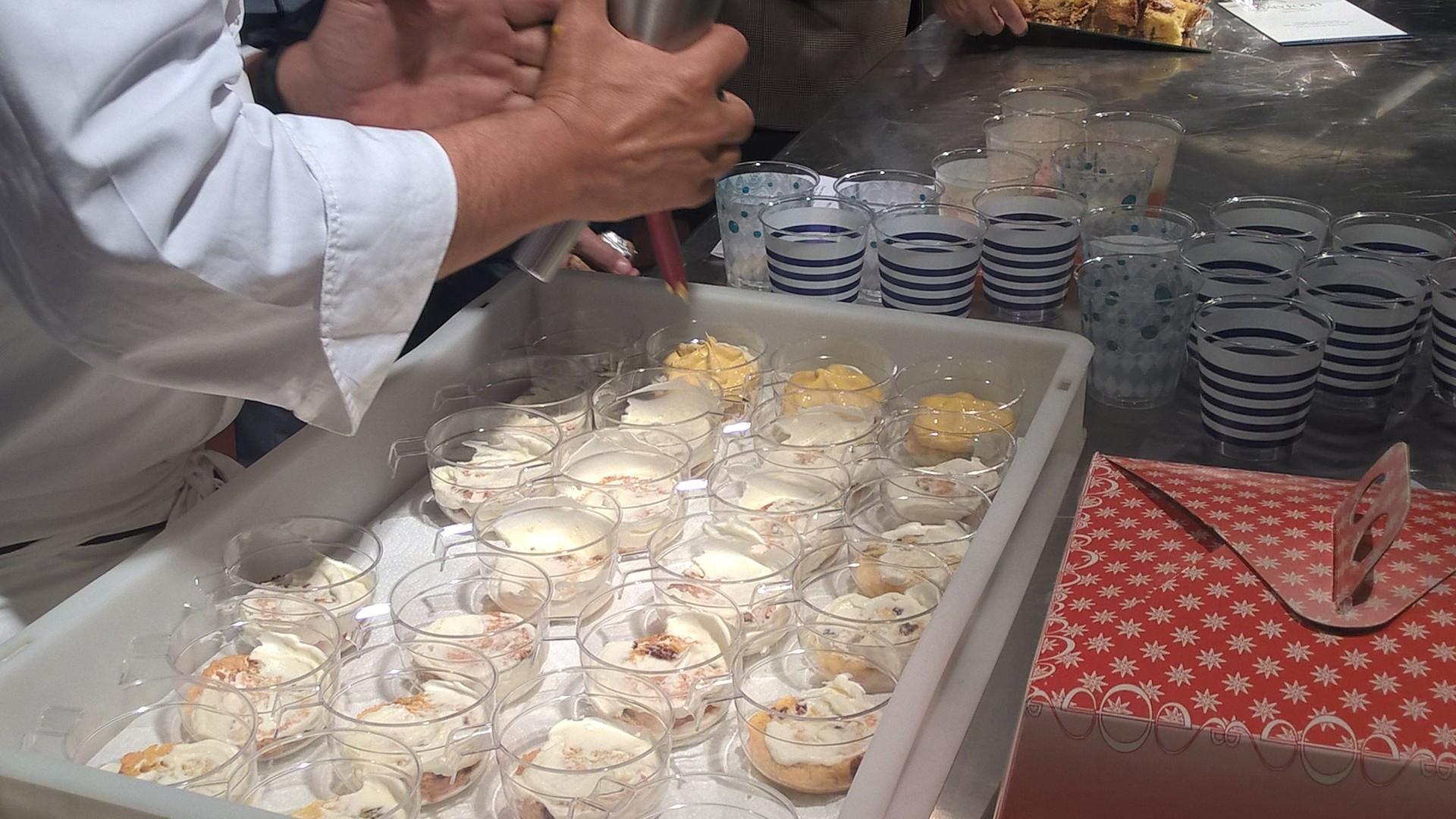 Lo chef massimo Guzzone ha preparato dei piatti di dessert a base del panettone del panificio Barra, con l'aggiunta di un bagno di emulsione di mascarpone, panna ed infine il caffè; il tutto perfezionato con “olio di gomito” per ben amalgamarlo.